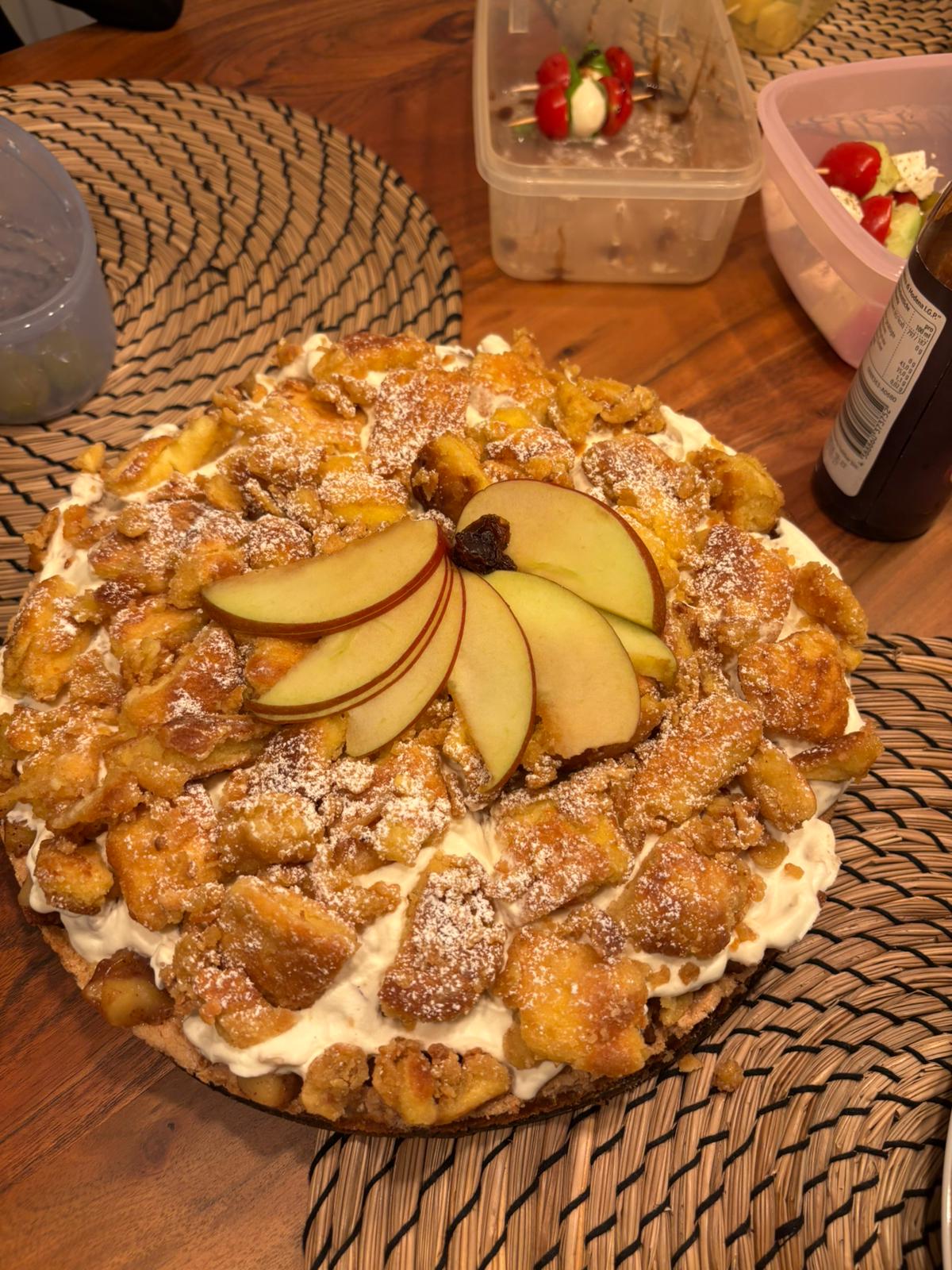 Schon optisch ist klar: Das hier ist keine Spielerei. Auf einem stabilen, selbstgebackenen Boden sitzt eine großzügige, aber gleichzeitig nicht zu umfassende Schicht Creme, darauf karamellisierte Kaiserschmarrn-Stücke, unregelmäßig, rustikal, genau so, wie sie sein sollen. Leicht mit Puderzucker bestäubt, in der Mitte mit frisch geschnittenen Apfelspalten dekoriert – kein Zwang zur Perfektion, sondern ehrliches Handwerk.